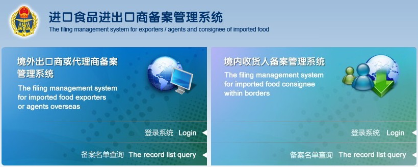 2012年10月1日起,中国质检总局为掌握食品进口相关报关、代理服务进出口商信息及食品进口相关报关、代理服务来源和流向,保障食品进口相关报关、代理服务可追溯性,有效处理食品进口相关报关、代理服务安全事件,保障食品进口相关报关、代理服务安全,向中国大陆境内(不包括香港、澳门)出口食品的境外出口商或者代理商,以及境内食品进口相关报关、代理服务的收货人进行备案管理。